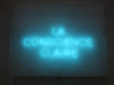Le grand néon « L’effondrement des enseignes lumineuses » est plutôt une question : que se passerait-il si notre système construit sur la société de consommation s’effondrait ? Nourri de Marx et de Debord, Jean-Michel Alberola n’annonce pas un grand soir, mais avec une grande distance, il interroge sa capacité d’artiste à faire bouger les lignes. C’est le sens de ce néon bien trouble « Une conscience claire » associé à une phrase de Marx « On verra alors que, depuis longtemps, le monde possède une chose en rêve et que pour le posséder réellement seule lui manque la conscience claire… ».
