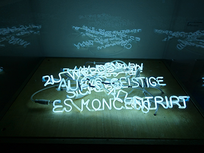 • Peint au mur : « La pauvreté est une idée neuve en Europe », qui pourrait sembler du plus mauvais goût, alors que les références à saint François d’Assise sont multiples dans la salle. Ailleurs, « La pauvreté » (2006), un splendide néon blanc en vrac, reprend une phrase du poète Hölderlin (1799) « Chez nous, tout se concentre sur le spirituel, nous sommes devenus pauvres pour devenir riches ».