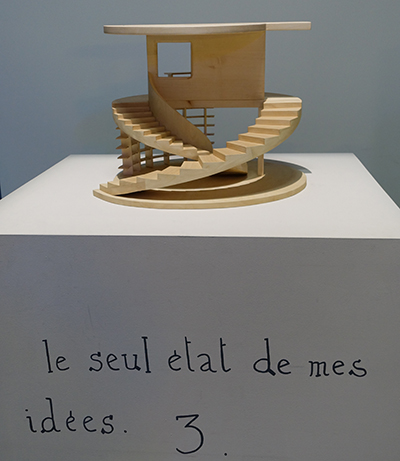 L’exposition a été mise en scène par l’artiste lui-même, comme un appartement où les pièces communiquent les unes avec les autres, une fenêtre donnant sur une salle plus éloignée. C’est une allégorie de la pensée de l’artiste dont les intentions de cartographie mentale sont révélées dans la dernière vitrine, juste avant de sortir.