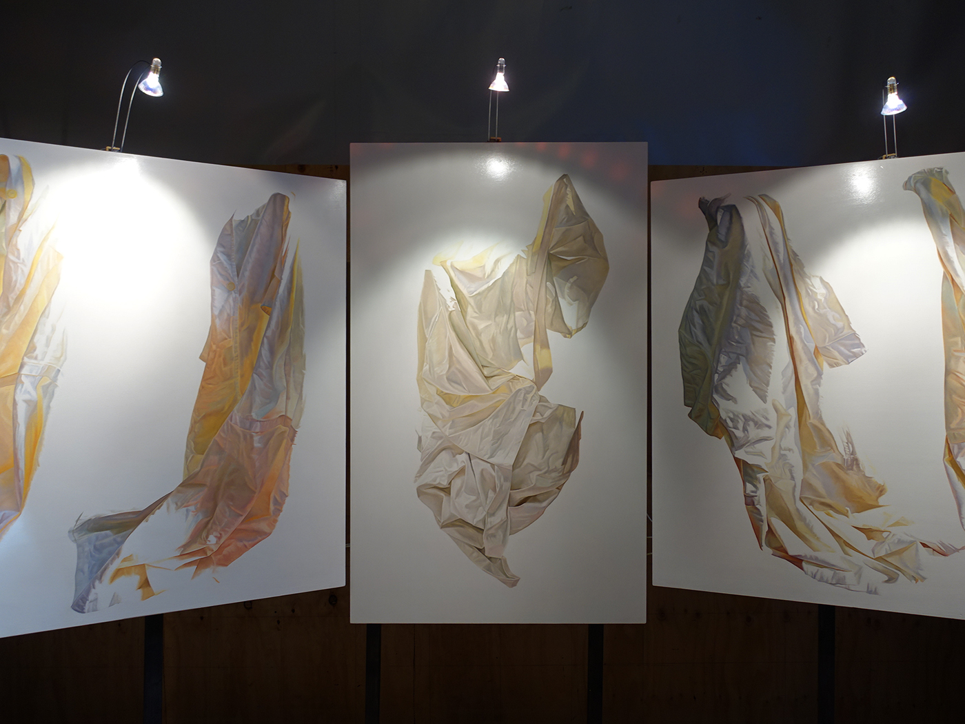 Mais ce qui « fait » le tableau c’est le titre que l’artiste lui donne ainsi que la place des figures dans un ensemble de panneaux. Si l’on peut dire que Caroline Chariot-Dayez ne peint pas du tissu, on pourrait même affirmer « Ceci n’est pas un pli » car c’est plus que cela.
