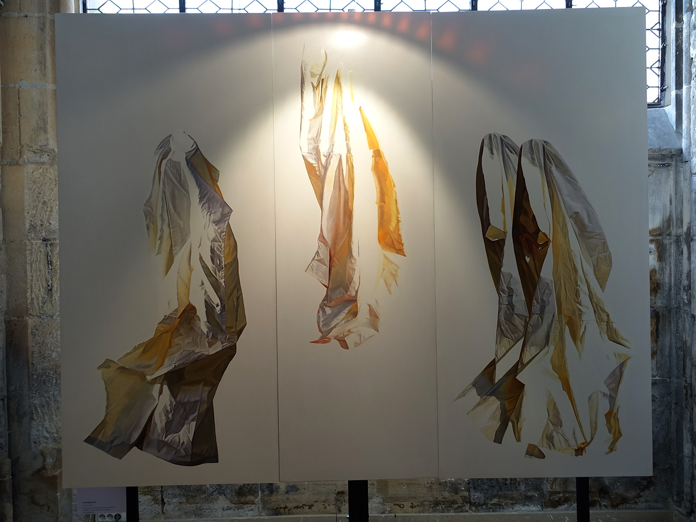 Caroline Chariot-Dayez est une professeure de philosophie qui vit et travaille à Bruxelles. Elle est « conceptuelle » tant par sa formation intellectuelle que par sa posture artistique. Elle n’utilise que des panneaux de bois et y peint, sur fond blanc, des tissus ou plutôt leurs plis. Elle ne cache pas son jeu, c’est une croyante et son art est mis au service de sa recherche spirituelle : exprimer l’invisible et les racines de sa foi. Les titres donnent une signification à ce que le visiteur voit. La mise en scène des tableaux vient renforcer son propos.