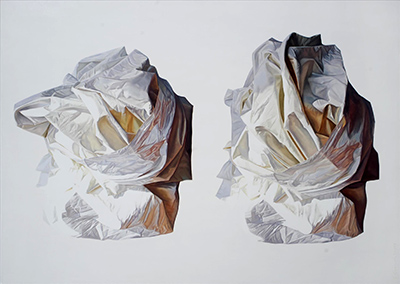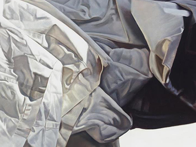 Ne cherchez pas à savoir si elle peint autre chose que des tissus pliés. Elle ne montre rien d’autre. Ils constituent à la fois un monde esthétique, un langage, un support de réflexion et d’engagement de sa foi. Sa posture de répétition ou de déclinaison d’un objet la rapproche d’un Georgio Morandi qui, toute sa vie, n’a peint dans son atelier que des natures mortes très ordonnées faites de récipients et de bouteille et dont l’œuvre énigmatique et subtile a été rapprochée de toute une peinture métaphysique. Caroline Chariot-Dayez peint de façon réaliste non pas des morceaux de tissus, comme on pourrait trop vite l’affirmer au premier regard, mais des plis. Si peindre des étoffes, vêtements ou tissus d’ameublement, est une tradition aussi vieille que la peinture elle-même et est sujet à des recherches stylistiques propres à chaque époque [1] , ce n’est pas ce matériau qui est le vrai sujet des tableaux, mais le pli, c’est-à-dire la double épaisseur obtenue en rabattant sur elle-même une matière souple. Par nature, le pli cache un creux d’où surgissent des jeux de lumière et d’ombre, ou suggère une intention, un geste. Le pli engendre des traits, des formes et a une signification, une raison ; il peut traduire un projet plastique. Les emballages du plasticien Christo utilisent ce mécanisme du pli, en le forçant avec des cordes, pour révéler des architectures, pour épurer un objet complexe et aller à l’essentiel. Avec Caroline Chariot-Dayez, on pourrait dire que le tissu est secondaire, mais qu’il est pourtant fondamental pour engendrer le pli et plus encore la lumière surgissant des différentes combinaisons. Pli et lumière vont de pair dans ses tableaux qui sont tous différents et suggèrent une infinie diversité de situations dans un réel, qui peut être visible ou invisible.