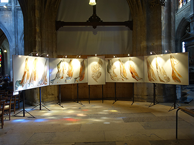 L’ordonnancement et la mise en scène d’un ensemble de tableaux tous différents, mais faits dans une même inspiration (rapport à une question de foi, couleur, mouvement du tissu, lumière) renforcent le sens voulu par l’artiste. À force d’exposer dans des lieux religieux, elle sait jouer des espaces pour créer de l’émotion, car si le concept philosophique est au début de sa démarche, elle n’a aucun désir de peindre des concepts ! Elle souhaite simplement faire partager son expérience de l’ordre de l’esthétique pour certains, de foi pour d’autres, et plus souvent des deux pour les visiteurs d’une église.