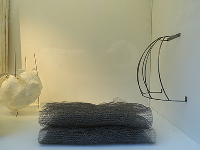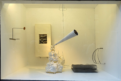 Galerie Saint-Séverin <19-06-16. Une œuvre étrange d’une artiste chypriote. Cinq objets en situation d’une belle scène de théâtre, où le vide, le noir et le blanc dominent. Une question : que connaissons-nous du monde ?