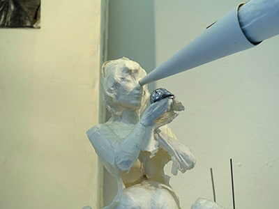 Artiste chypriote, Maria Loizidou, qui a fait ses études artistiques à l’École nationale supérieure des Beaux-arts de Lyon, vit et travaille à Nicosie. Elle développe depuis ses débuts un travail où la sculpture procède aussi bien de la terre que du métal, de la résine que du papier ou bien de la fonte. C’est ainsi qu’elle adopte une posture où les matériaux les plus divers deviennent aussi bien des dessins que des peintures ou des sculptures qu’elle propose d’installer à l’intérieur comme à l’extérieur. Les œuvres, quels que soient leurs supports et techniques, peuvent-être posées, fixées ou suspendues. Pour la Galerie Saint-Séverin, l’artiste met en scène la présentation en 3 dimensions d’un précepte comme celui de la découverte de la Connaissance, une notion universelle comme celle de dieu et du sacré mais qui, aujourd’hui, est encore trop souvent difficile d’accès. Le titre « La statue aux yeux ouverts pour mieux entendre » sonne comme une interrogation, une énigme venue de notre Antiquité occidentale, celle qui prend ses racines sur les rives nord de la Méditerranée entre Chypre, la Crête et la Grèce.