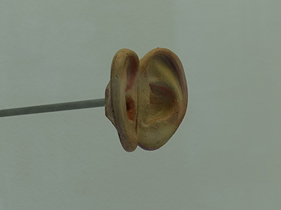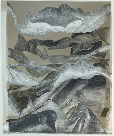 Maria Loizidou dispose son argument de façon à ce que le vide soit aussi important que les œuvres exposées. Au fond, posé contre la paroi, son dessin mural en trois dimensions ressemble à une scène de théâtre. Il est fait de papier coupé et collé sur lequel le décor d’un paysage interprété apparaît à la mine graphite. Sur la paroi de gauche, la paire d’oreilles factices est fixée au mur à l’aide d’une légère ossature de métal qui la présente en suspension, en interrogation, à l’écoute.