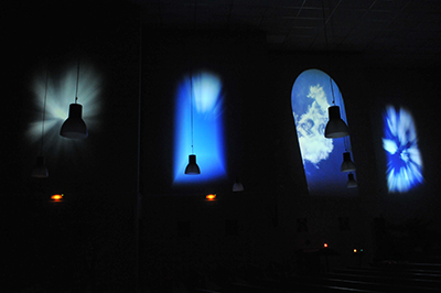 Œuvre d’une nuit, la Nuit sacrée, samedi 28 mai, reprise probablement durant l’hiver 2016-2017 sous une autre forme. Installation visuelle et sonore immersive, elle se compose d’un polyptyque de vidéos mises en boucle et projetées à la verticale en forme de fenêtres : contemplation de plusieurs cieux qui, subrepticement, se brouillent, se diluent, s’assirent.