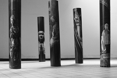 Des cylindres de grandes photos de gisants prises dans la Basilique de Saint-Denis. Une scénographie qui se mesure à la force des piliers de Saint-Merry. Un parcours où la photographie amplifie l’architecture. Un travail sur le temps (de la sculpture, de l’architecture, de la photographie).