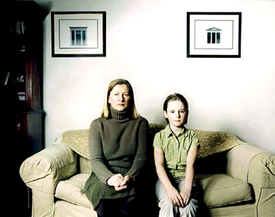 Ensemble de photos prises dans le cadre d’une stricte procédure : une mère et un père avec leur enfant sur le canapé de leur salon dans des vêtements identiques. Une vision d’une vingtaine de familles issues de classes sociales différentes et de pays différents