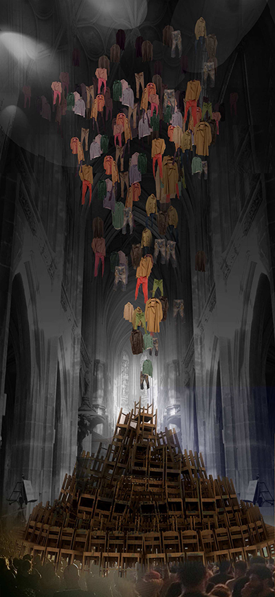 Une tour de Babel faite des chaises de l’église, des vêtements qui descendent de la voûte et viennent à sa rencontre. Une installation « sensible » qui nous parle de l’ « Au-delà », de l’être humain et de son aspiration à la spiritualité. Rendre hommage à toutes les victimes des attentats de Paris en 2015 et à tous ceux qui leur ont porté secours. Un titre pour exprimer l’immense cri collectif de rassemblement et de résistance.