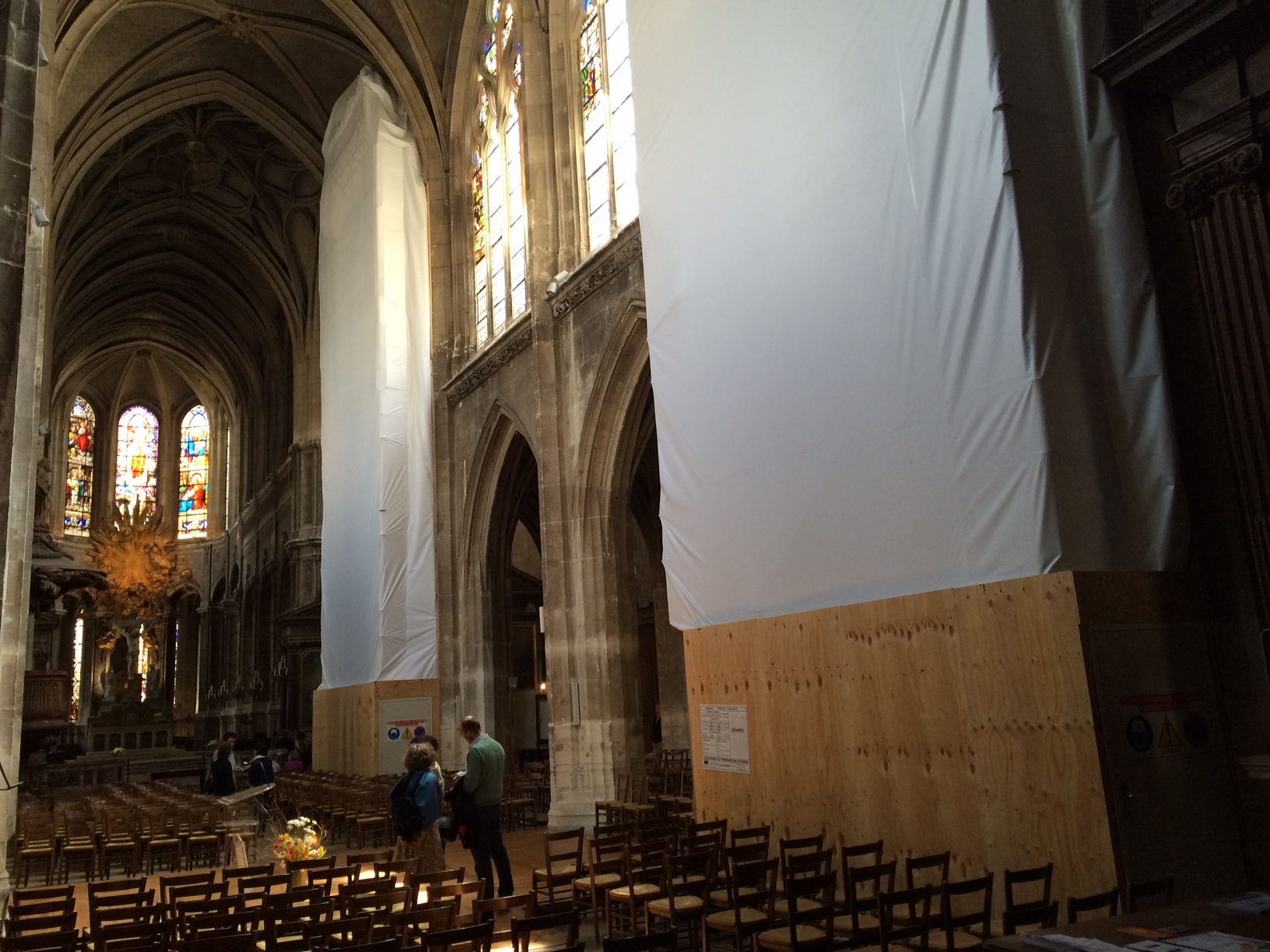 Les deux grandes toiles faisant fonction d’écran sont blanches et montent du sol à la voûte. Leur présence dans la nef de cette église est forte. On peut y lire des symboles d’élévation et, par leur caractère immense et immaculé, un désir de pureté et de détachement.