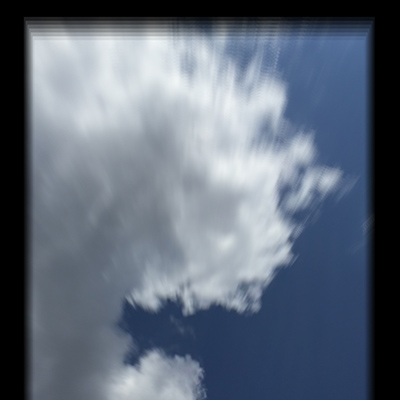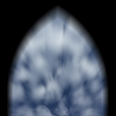 Le cadre des ciels. Alberti, savant et artiste de la Renaissance, qui avait donné une signification humaniste à la perspective, avait utilisé la figure d’une fenêtre ouverte sur l’histoire et le monde [2] . De là partaient des lignes de fuite qui se rejoignaient à l’infini et donnaient la profondeur, le tracé du cadre précédent celui des lignes. Edouard Taufenbach fait un peu de même et propose un cadre de fenêtre qui sépare l’intérieur flou de ses images mobiles d’un extérieur noir. Initialement, il avait utilisé un cache numérique incrusté dans l’image évoquant des embrasures d’arche romane.