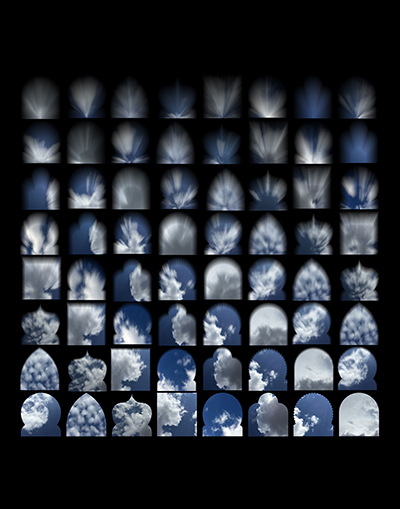 S’il vient le samedi 28 mai 2016 à Saint-Merry, le visiteur a vu vibrer, lentement et continûment, des ciels photographiés de jour, projetés ici la nuit sur deux grandes toiles blanches, des bâches d’échafaudage, et dans des cadres de vision hautement symboliques : des fenêtres évoquant des cultures et les religions qui leur sont attachées.