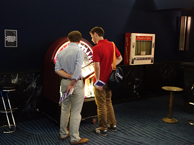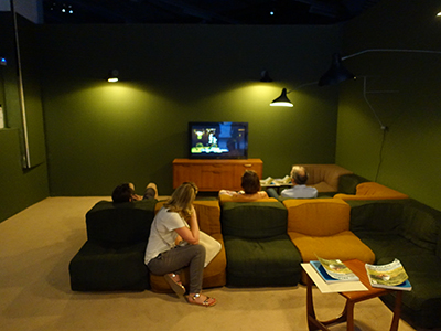 On le saisit vite, Michel Houellebecq penche pour le conceptuel, c’est l’intention qui compte, dans une ambiance surannée comme son fumoir (on peut même y fumer !) avec un vieux jukebox ou ce salon avec une télé où il se raconte devant des spectateurs affalés dans des canapés des années 70, ou encore cette pièce, avec une moquette et des tissus muraux conçus par un designer des années 60, Maurice Renoma, ou l’on peut voir des films saphiques réalisés à l’époque pour Canal +, du temps de l’érotisme soft avant le déferlement du porno.