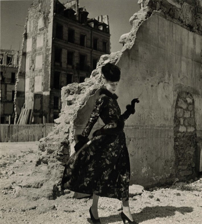 – En 1946, un modèle marchant avec énergie seule devant un mur écroulé. Paris partiellement détruit est toujours le lieu de la création de mode