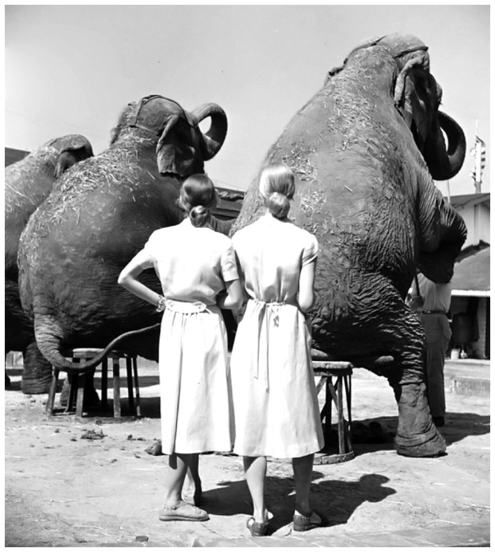 L’époque est marquée par le surréalisme, Louise Dahl-Wolfe y est sensible : la visite au zoo de deux modèles de blanc vêtus, prises de dos devant deux éléphants assis exprime le contraste complet entre l’élégance et la lourdeur.