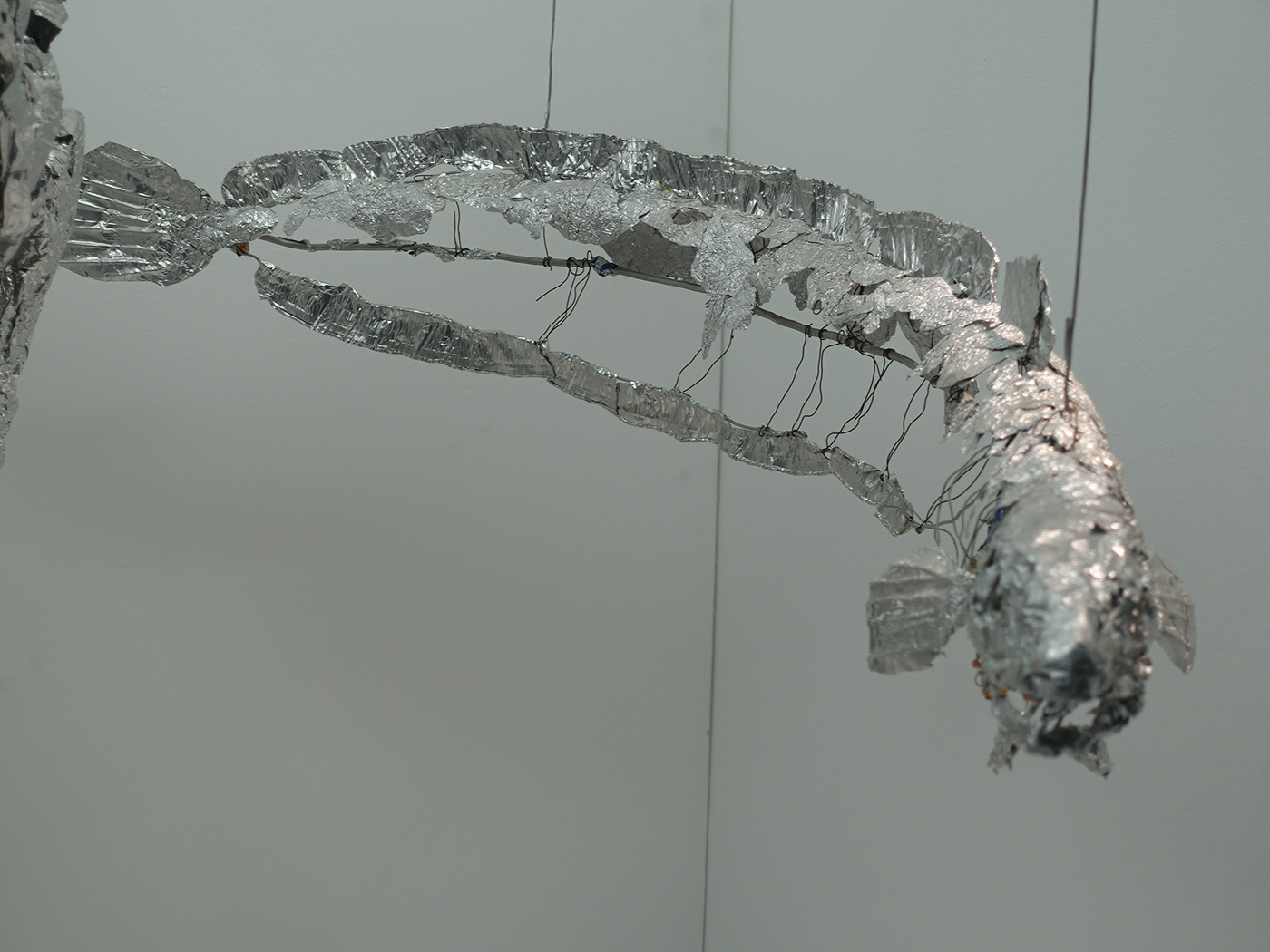 Pour Les poissons de l’air, l’artiste reprend la lecture de Victor Hugo dont un de ses romans " Les travailleurs de la mer " (1866), écrit durant son exil à Guernesey, qui lui inspire déjà en 2015 son impressionnante sculpture Gilliatt érigée en feuilles d’aluminium. Elle représente le héros ultra-romantique à la beauté inquiétante due à cette musculature puissante combattant la pieuvre dans une étreinte ultime et fatale. L’œuvre créée in situ pour la Galerie Saint-Séverin présente ici l’image d’une tête de jeune fille émergeant de l’eau invisible tandis que deux poissons hybrides, écorchés et pourtant bien vivants, montent la garde en nageant dans l’air. Comme sous la plume de l’illustre écrivain, les éléments se mélangent et s’échangent : le ciel devient la mer, l’air devient l’eau. Est-ce tout simplement le portrait sentimental de l’héroïne du roman ou bien celui idéalisé d’une héroïne qui triomphe de l’Amour dans la plénitude ?