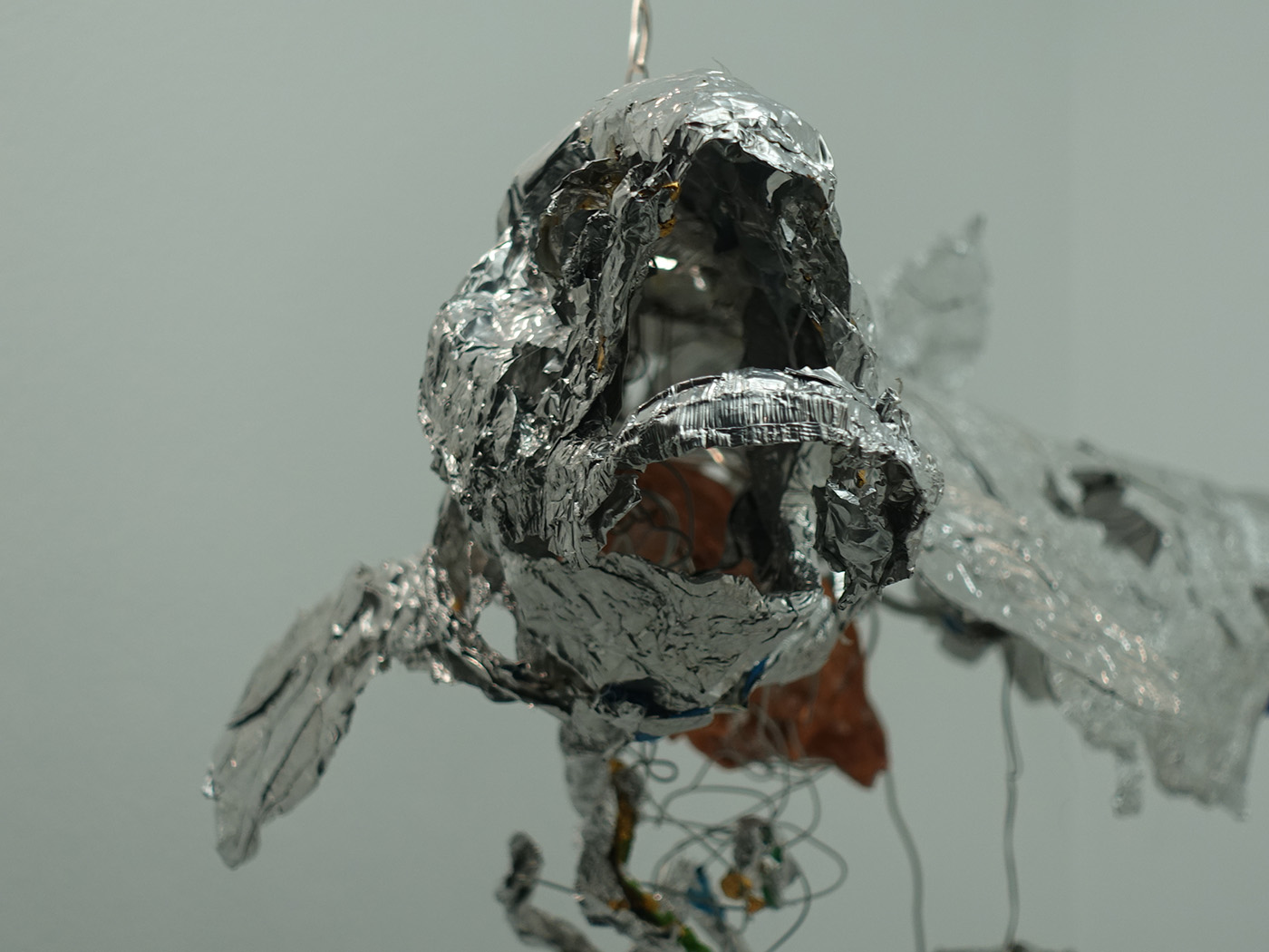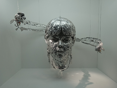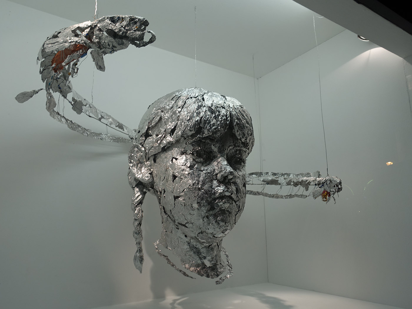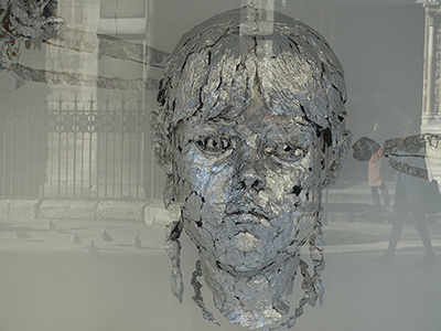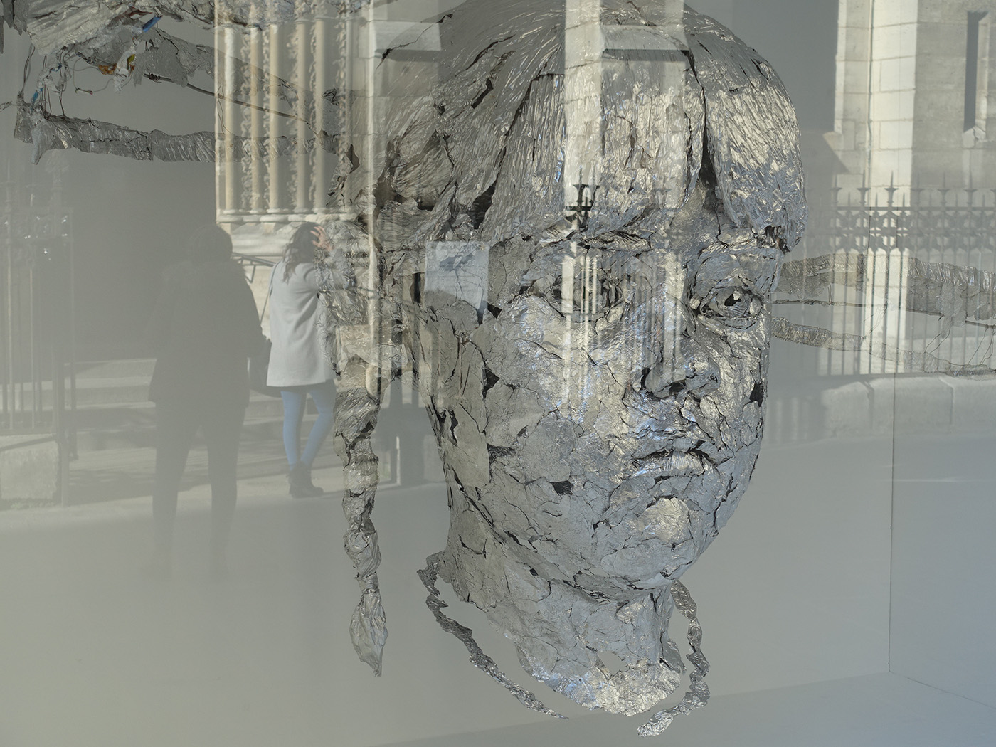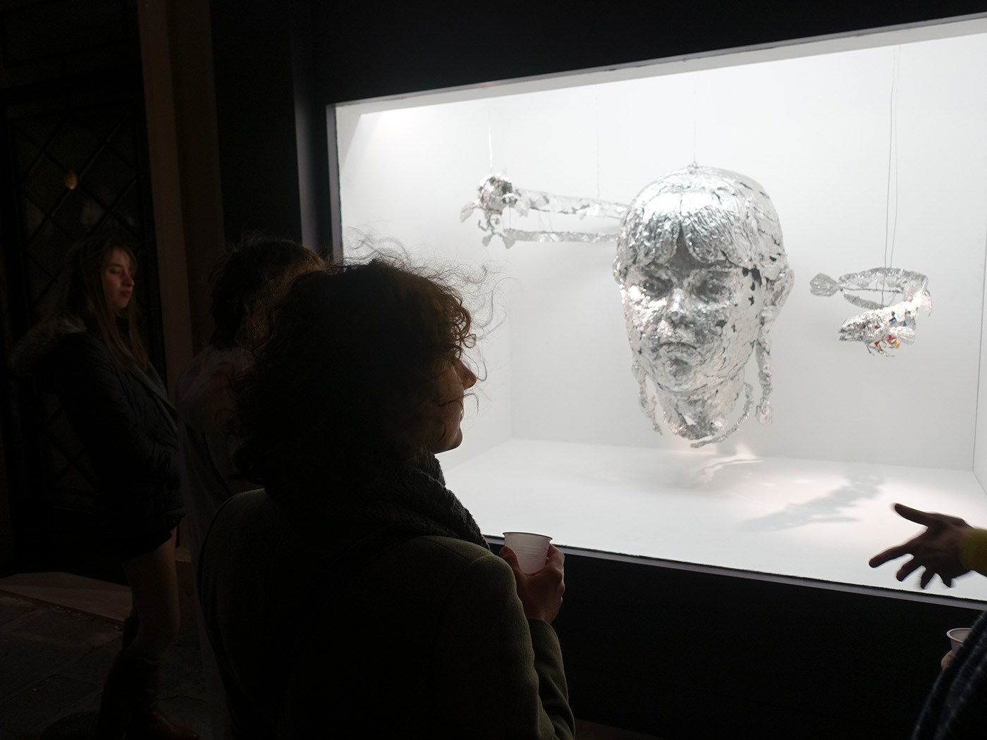 Le passant ne peut manquer cette sculpture de tête d’enfant, un mètre de haut, toute en bribes de feuilles d’aluminium. Sa présence et son regard attirent comme les œuvres des grands sculpteurs, qui se font désormais très rares ; et pourtant elle pourrait évoquer une gueule cassée de la Première Guerre, tant l’artiste a su jouer à la fois avec le vide et la surface. Deux hybrides d’anguilles tournent autour de manière énigmatique, mais à peine menaçante. La nuit, l’ensemble témoigne d’une forte présence, gardienne de la galerie ; le jour, avec les reflets du soleil, il devient hologramme dans l’espace public.