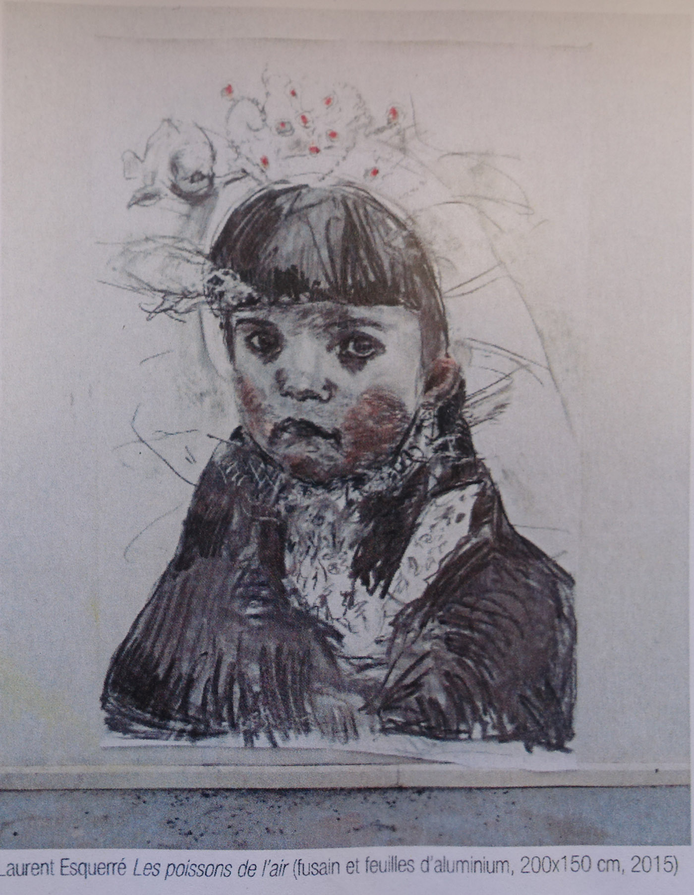 Le choix d’une tête seule comme sujet principal n’est pas commun, mais Laurent Esquerré tente et réussit à faire respirer ce paysage onirique par la transformation de la feuille d’aluminium en « pulpe d’aluminium » dixit l’artiste qui nous embarque dans l’univers fantastico-romantique de Victor Hugo pour nous faire aborder les rivages du baroque. Les poissons de l’air semblent une improbable, mais réelle vision d’un mix entre " Dentelles et spectres ", dessin de Victor Hugo (vers 1855), où il fait apparaître sur une feuille de carnet à dessins la tête d’un spectre par l’impression d’une dentelle préalablement trempée dans de l’encre de Chine et, cette séquence du " Casanova" de Federico Fellini (1976) où émerge de l’eau sombre et brillante du Grand Canal de Venise une tête couronnée de Carnaval.
