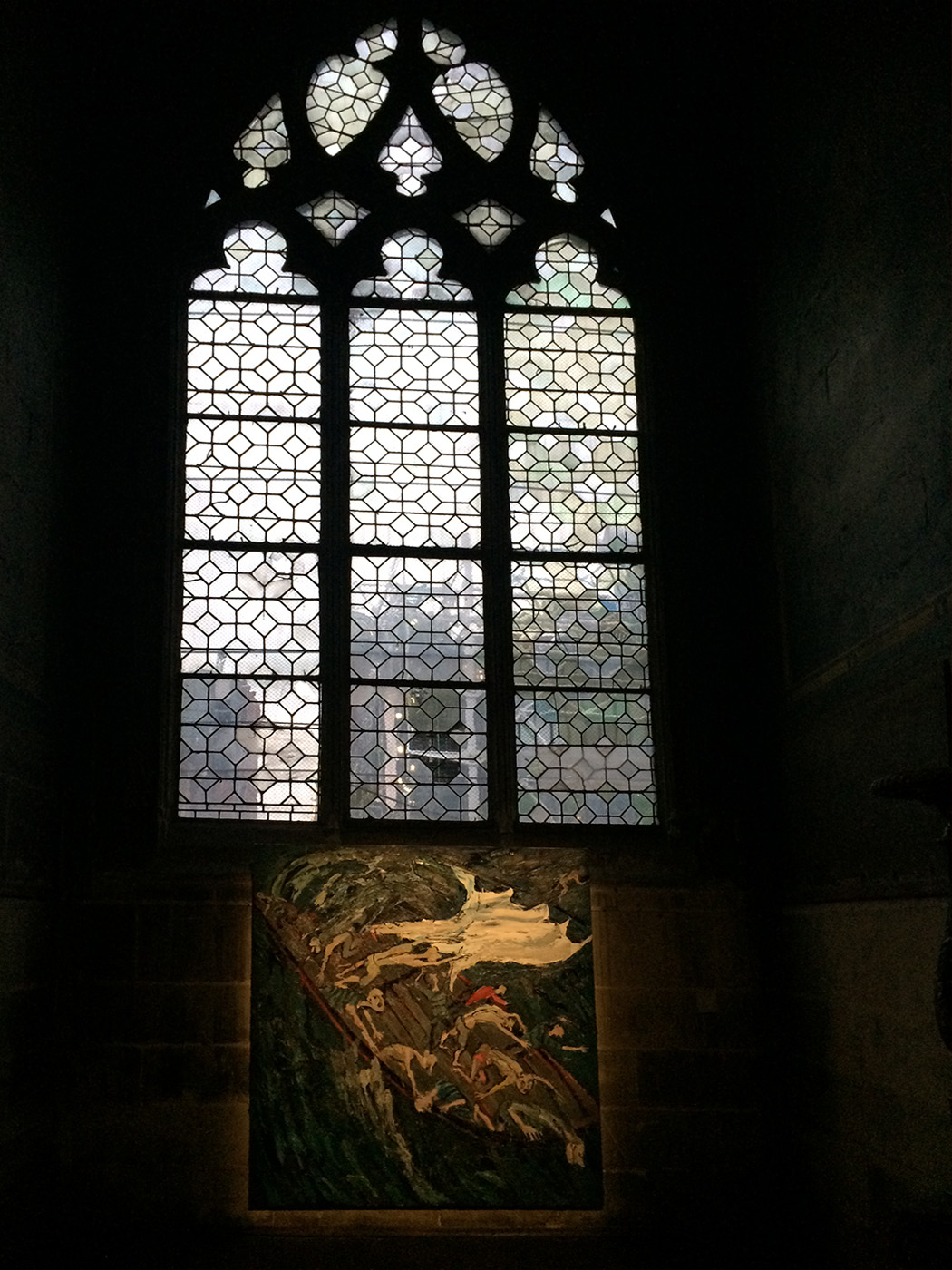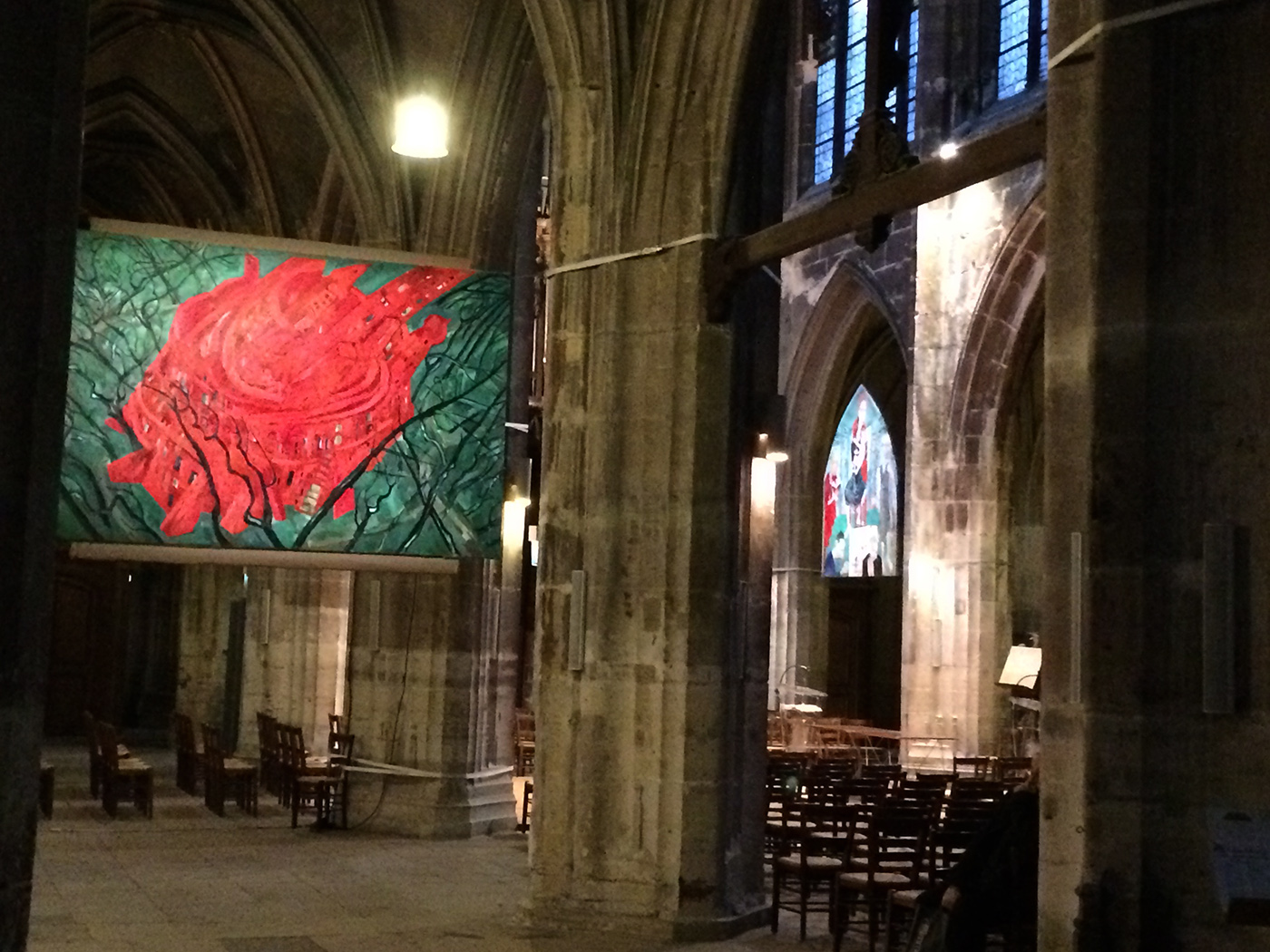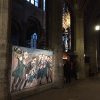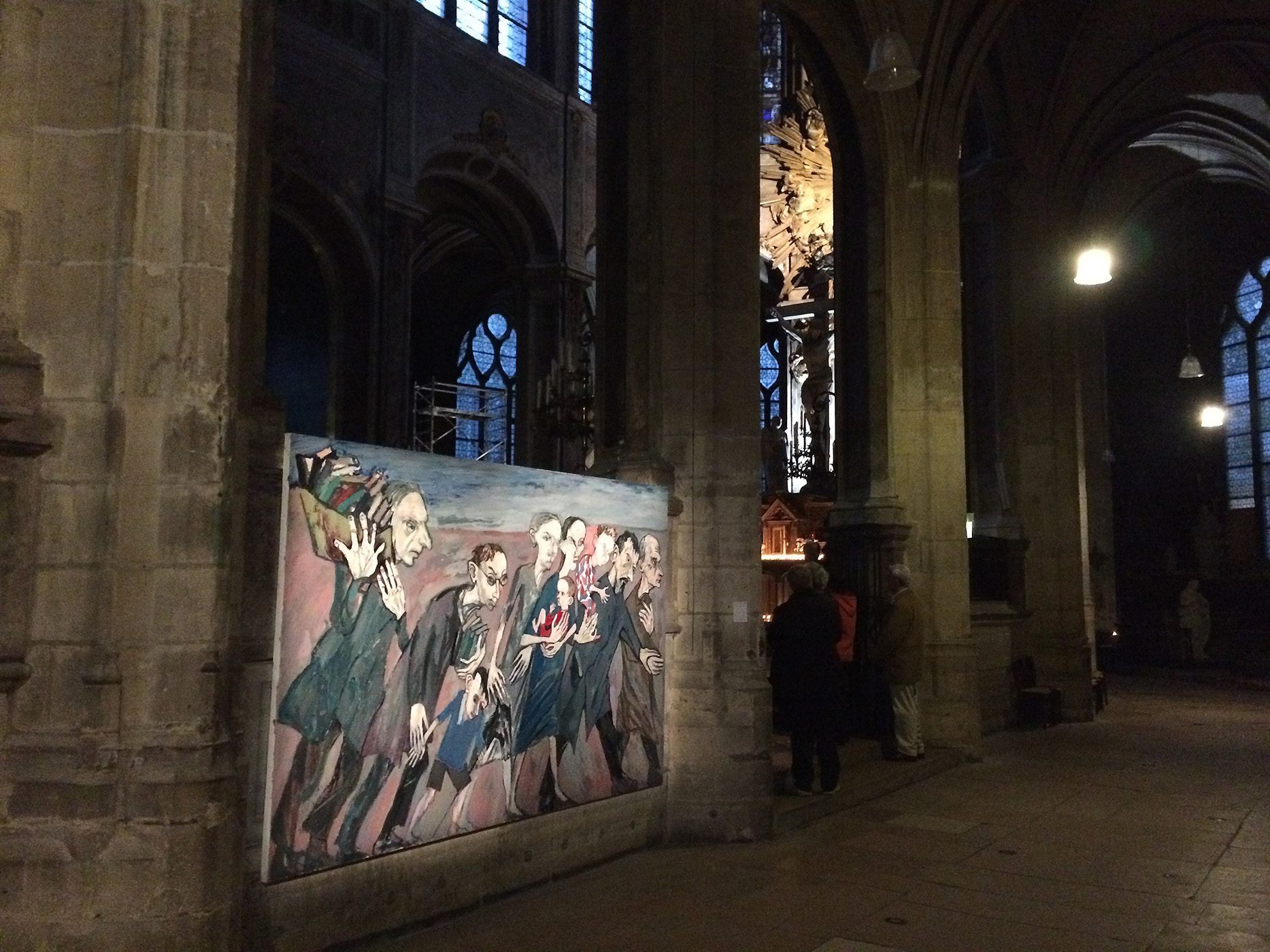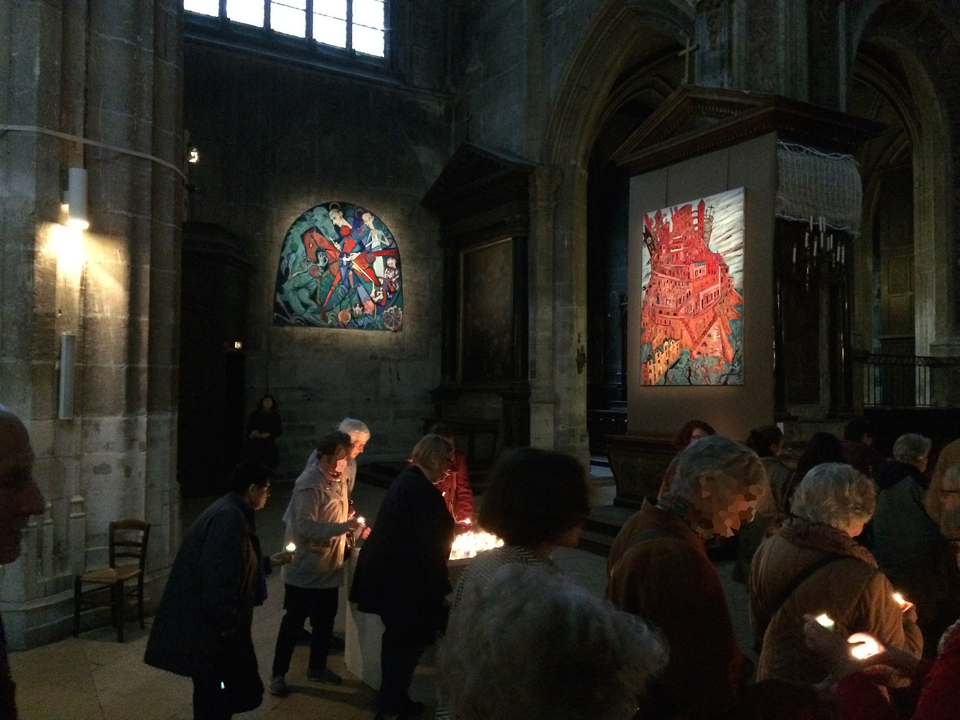 Au centre de Merry Cathedral, le tableau offert à Saint-Merry, une rosace colorée, l’humanité dessinée en noir et blanc cheminant autour. Maxim Kantor, intrigué par la grande rosace de Saint-Merry, faite de simple verre blanc et cachée par l’orgue, a imaginé ce qu’aurait pu être ce vitrail dans l’esprit du lieu.