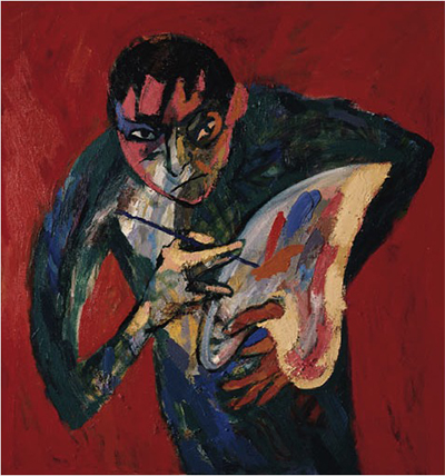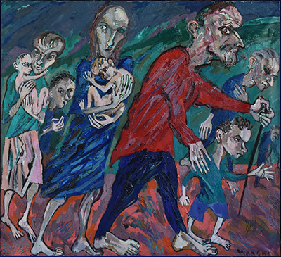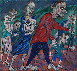 En se peignant en rouge, au milieu de sa famille, tous nu-pieds, dans le dénuement, lacérés de traits colorés, il s’identifie à ces hommes aux regards angoissés, qui ont la rage de vivre et avancent coûte que coûte comme le signifient leurs mains orientées vers l’avant, vers le futur.