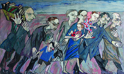 Ce tableau de groupe, très subtil par ses couleurs, aborde la migration, non l’exode des réfugiés qui relève d’un autre registre social et politique, mais l’expérience intime de l’artiste.
