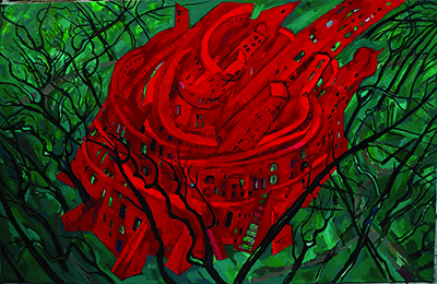 Ce tableau très graphique et plein de mouvement est dominé par deux couleurs primaires intenses, le vert et le rouge, traduction chromatique d’une confrontation. Une ville-cathédrale, avec clochers et toits en bulbe, rouge de la force de l’espérance, solidement fondée dans le sol, résiste aux vents, à la tourmente et aux tremblements de terre. Elle se dresse au milieu d’arbres, sans feuilles, noirs ou calcinés, symbolisant, comme dans d’autres œuvres, une humanité vide de spiritualité. Symboliquement, l’artiste affirme que la force de la foi chrétienne résistera au mal.