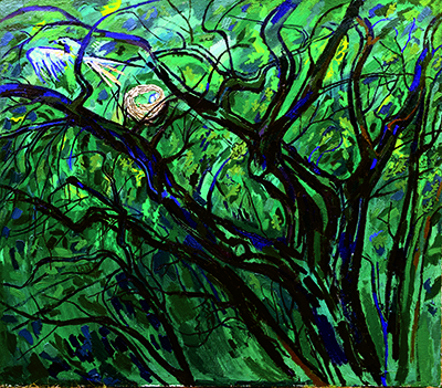 Le nid est un tableau densément peint aux multiples nuances de vert et de bleu, un intérieur de forêt, où s’impose un arbre immense, fort, torsadé comme sous l’effet du vent. Cette figure que l’on retrouve dans d’autres tableaux exprime la force de vie et la solidité spirituelle qui sont les siennes, le débordement des branches suggérant peut-être ses engagements. Un nid, un oiseau : les figures du printemps, de la famille si importante chez lui, du renouveau humain et spirituel.