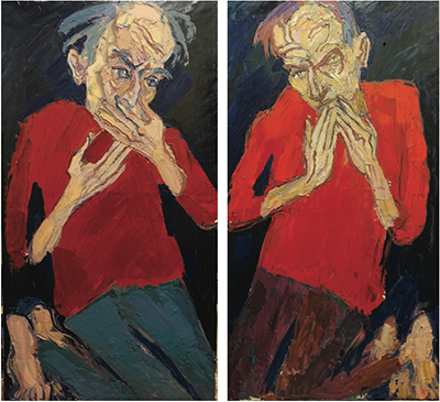 De ces taches rouges, presque abstraites, sortent mains, pieds et visages très expressionnistes, accentuant l’humanité des deux personnages. On peut y lire l’introspection et l’angoisse pour l’un, la louange pour l’autre, comme l’est la prière des psaumes. La version de 2017, peinte avec une brosse vigoureuse et fondamentalement expressionniste, mêle inquiétude métaphysique et sérénité humaine.
