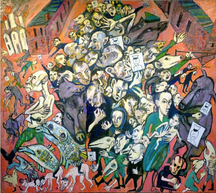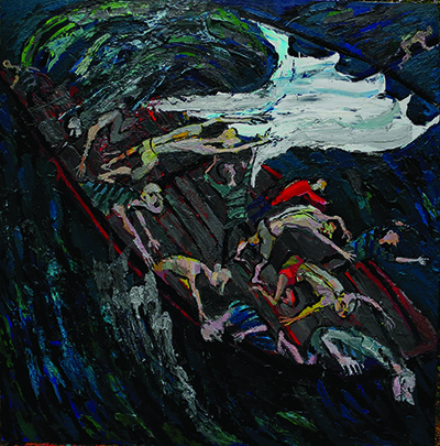 Si le titre, Le bateau ivre, peut évoquer le fameux poème d’Arthur Rimbaud, il faut plutôt associer ce tableau à celui de Jérôme Bosch, la Nef des fous ou aux illustrations par Albrecht Dürer du poème de Sébastien Brant. Mais chez Maxim Kantor le ton n’est ni ironique ni moralisateur : l’homme est en danger, l’Europe aussi.