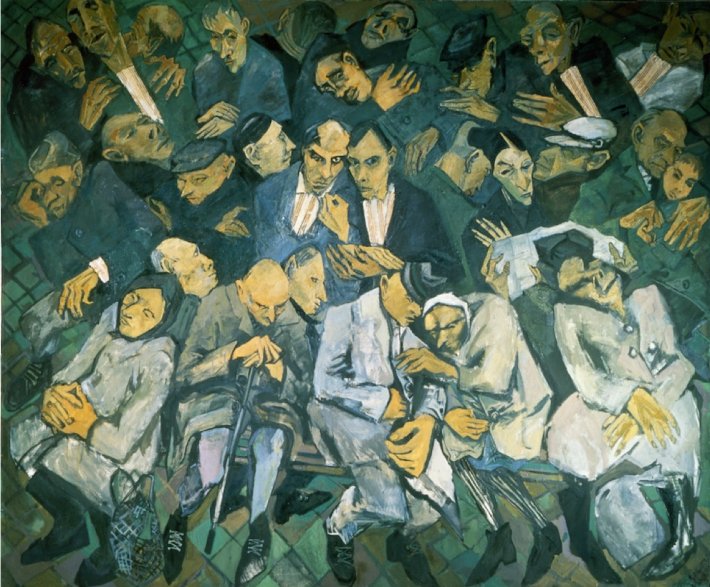 L’idée est commune chez les grands peintres : rassembler ses relations, sa famille ou ses collègues dans un endroit emblématique — l’atelier, le café, la maison — et faire un tableau de groupe répondant à des visées précises sur l’art et la société. Maxim Kantor qui ne représente précisément que ses très proches va ici au-delà de ce cercle habituel : ce sont ses amis les plus chers, de pays différents, qu’il rencontre souvent et avec lesquels il échange abondamment. Tous partagent l’amour des livres, essentiel pour ces intellectuels dont ce sont les seuls bagages, en référence au destin que portent symboliquement les migrants dans les tableaux peints par d’autres artistes.