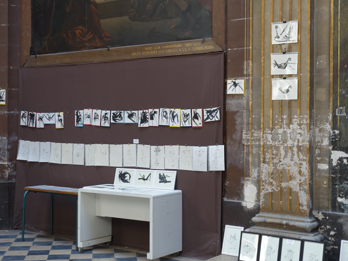 Plutôt que de cacher les travaux en cours, il a été proposé à cet artiste de talent, et connu des milieux de l’édition, d’animer, comme il le voulait, l’espace de la nef à l’aide de pièces relevant d’une partie de son œuvre : des petits dessins sur des A4 ou A5, encadrés ou non.