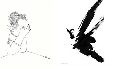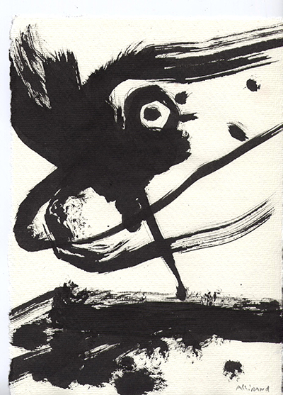 « Mes dessins figuratifs regroupant des hommes, des femmes, des enfants... et mes animaux de prédilections que sont chiens et oiseaux (oiseaux à l’encre de Chine). »