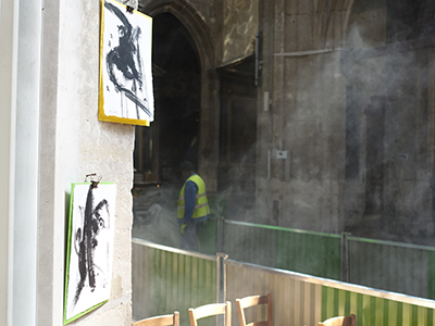 Un dessinateur envahit l’espace d’une église éventrée pour cause de travaux. Des oiseaux et des personnages légers, joyeux. Un « chèque en blanc et noir » au stylo et à l’encre de Chine.
