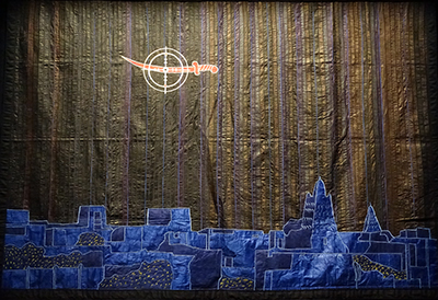 Cette œuvre exprime l’engagement de l’artiste contre l’occupation du nord Mali par des groupes salafistes djihadistes. Le sabre islamiste dominant la ville de Tombouctou est neutralisé par la cible qui l’encercle. Avec ce bleu intense et d’autres couleurs qui s’y intègrent, l’artiste travaille le textile finement, en rendant hommage aux tisserands du pays qui emploient des cotonnades naturelles teintes selon la technique du bogolan.