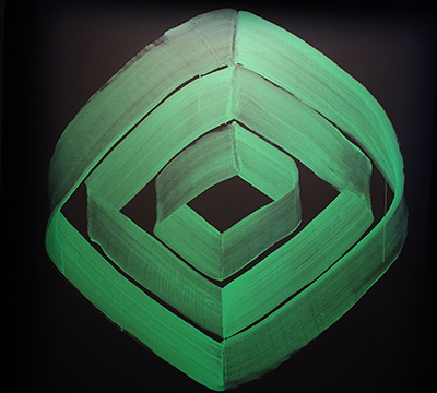 En 2015, Najia Mehadji a fait des séries de tableaux autour des Gnaouas, confrérie dont les membres sont connus pour leurs musiques et leurs transes. L’artiste les traduit dans sa manière de peindre avec vigueur et simplicité. Les trois rubans de Möbius où l’intérieur devient l’extérieur, évoquent les danses cosmiques en circonvolution et le vert fait référence à l’esprit de la forêt, les confréries ayant gardé des traces des cultes préislamiques.