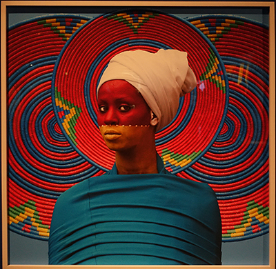 Cette jeune photographe éthiopienne utilise les codes du Body Art, tant par la peinture corporelle que par les habits de création contemporaine. Le modèle qui regarde le spectateur frontalement affirme sa liberté de femme, son identité, mais les intègre à la tradition de la vannerie d’Harar (voir portfolio) .