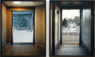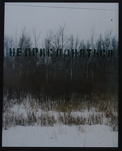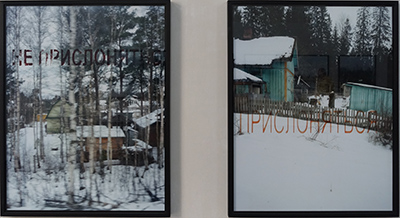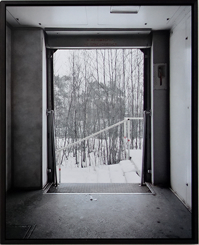 Chez Marie Bovo, le voyage est une récurrence dans sa manière de vivre, d’un pays à un autre. Ici, elle a utilisé les trains sur de longues ou de courtes distances en Russie et en Europe Orientale, en installant sa caméra sur l’étroite plateforme d’entrée du wagon. À chaque arrêt, et sans savoir ce qu’elle va trouver, elle prend une photo, juste avant que la porte se ferme comme un obturateur photographique ou juste lorsqu’elle vient de se fermer, la vitre faisant fonction de filtre de l’objectif tourné vers l’extérieur, la mention « ne pas s’appuyer » - не прислоняться -, ancien signe d’interdit, devenant un premier plan très graphique. Tout semble se répéter et les distances sont altérées par les effets de neige.