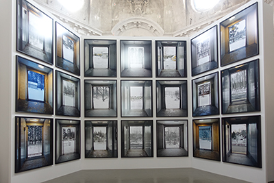 Au fond, un étrange mur de photos de portes, aussi frontal qu’une immense porte, tenant à la fois du triptyque religieux entre-ouvert et d’une iconostase laïque, à la Poliakoff (voir article Voir et Dire). Chaque porte a une dimension iconique, qui n’est pas sans rapport avec ce qu’a vu l’artiste dans ce pays où l’on assiste à un retour marqué du religieux. Marie Bovo a été bercée par la fréquentation familiale des églises et a retenu bien des souvenirs des peintures qu’elle contemplait pour ne pas s’ennuyer durant les offices religieux.