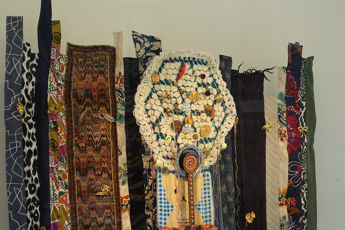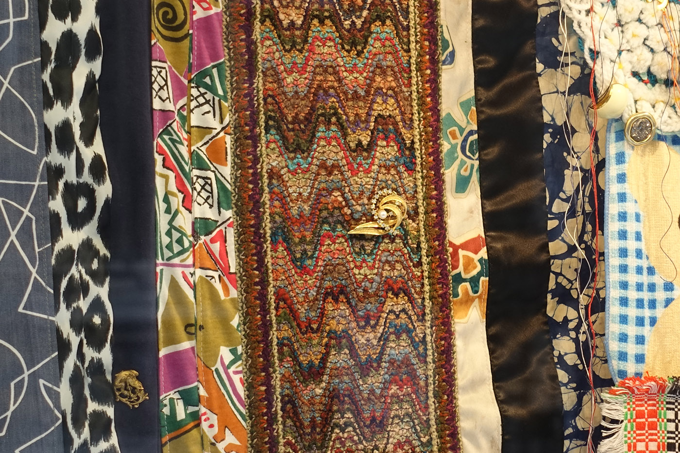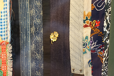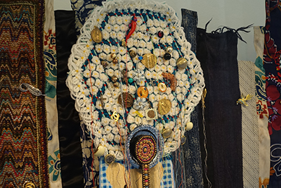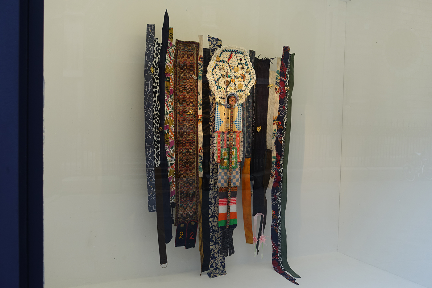 À y regarder de plus près, le passant découvre la superposition de tissus dont on peut s’amuser à imaginer l’origine : religieux d’Extrême-Orient, militaire, apparat, ordinaire, de France et d’ailleurs. Des broches féminines, des décorations réelles ou d’opérette la rendent semblable à un champ de fleurs visité par des insectes. Maîtrise et jouissance se combinent dans une pièce dont on aurait de la difficulté à dire la provenance, si elle faisait partie d’une exposition ethnographique !