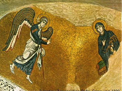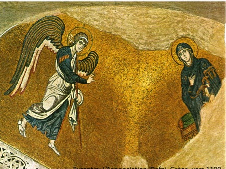Les églises offrent souvent l’occasion de tels instants. À l’époque byzantine, le fond or des mosaïques peut jouer ce rôle. Dans cette Annonciation, par exemple, la concavité du cul-de-four reçoit la lumière en différents endroits. Pendant quelques minutes, une colonne lumineuse et immatérielle se dressera entre l’archange et la Vierge, indiquant ainsi la venue prochaine du Dieu sur terre.
