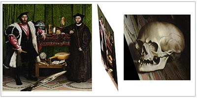 Hans Holbein le jeune, « Les Ambassadeurs ». Frontalement, entre les deux ambassadeurs peints par Holbein, on ne voit qu’une sorte de seiche oblique. L’image, incompréhensible, se redresse en un crâne depuis un point de vue oblique et impose aussitôt à l’ensemble du tableau une réflexion sur la vanité… D’autres détails [1] dans l’œuvre, comme l’a signalé Jurgis Baltrusaitis, relèvent d’une même habileté à se jouer des règles de l’optique (le globe terrestre à l’envers, le livre, la tête de mort dans le béret du personnage de gauche)