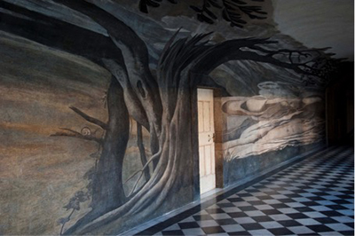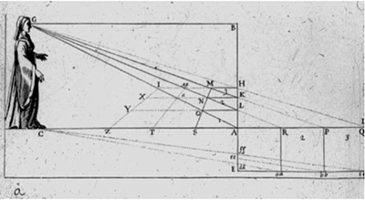 Celle réalisée en 1642 sur les murs du cloître de l’église de la Trinité des Monts à Rome par le moine Emmanuel Maignan suit de quatre ans la publication au même endroit, où se côtoyaient savants et théologiens, du traité sur l’optique de Jean-François Niceron. Selon le point de vue, on voit le portrait de saint Vincent de Paul ou son vêtement métamorphosé en un paysage dans lequel, la mer et les bateaux voisinent la montagne.