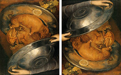 On connait les tests utilisés depuis la fin du XIXe siècle en psychologie pour, profitant des limites de la perception visuelle, libérer la parole inconsciente. Côté peinture, ils furent quelques-uns à proposer des images doubles, les uns, comme Giuseppe Arcimboldo à travers des figures phytomorphes livrant par exemple l’image d’un plat habité par des cochons de lait ou celle d’un cuisinier (1570, musée de Stockholm).