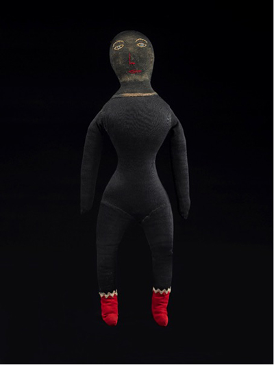 Jean Dubuffet avait raison, « L’art ne vient pas coucher dans les lits qu’on a faits pour lui ; (…) ce qu’il aime, c’est l’incognito. » Ainsi, cette figurine de cotonnade aujourd’hui exposée à La Maison rouge. Le corps sans grand souci ni d’expression singulière, ni de vraisemblance est curieusement terminé par une paire de bottines rouges haut lacées. Les traits du visage sont seulement indiqués par un travail de broderie. Du fil rouge pour la ligne du nez et les lèvres. Du blanc pour le contour des yeux au centre desquels brillent deux billes de verre bleu. De l’artiste, nous ne savons rien sauf qu’elle était noire et qu’elle n’était pas artiste, mais probablement simple servante dans l’Amérique des années 1890. On ignore de même à qui était destinée cette « poupée ». Dans l ’Afrique traditionnelle, la fabrication de ce genre de figurine peut revêtir une fonction magique. Dans certaines ethnies, les femmes en reçoivent afin de préparer leur mariage, voire pour contrer leur stérilité. Mais avant tout, et depuis l’Égypte ancienne, la poupée est un jouet. En Amérique, les colons en fabriquaient avec du bois, des enveloppes de maïs et du tissu. Et de même, avec du chiffon, les esclaves noirs. En cette fin du XIXe siècle dit « d’âge d’or » (surtout pour les hommes d’affaires) les anciens esclaves ont bien du mal à faire respecter le 13e amendement voté en 1865 qui accordait les mêmes droits aux blancs aux noirs. La poupée de chiffon peut alors devenir aussi un symbole de la lutte des minorités. Il existe même des figures doubles dites « sans dessus dessous » formées de deux bustes, l’un blanc, l’autre noir, collés l’un à l’autre, tête en haut pour l’un, tête en bas pour l’autre. Et quand la poupée est consommée comme « jouet », une autre question se pose : qui joue avec une poupée noire ? Car en cette même fin du XIXe siècle, de nombreuses poupées en porcelaine noire sont envoyées depuis l’Allemagne vers les villes américaines où elles sont offertes aux petites bourgeoises dont les parents, souvent, ont recours aux « nounous noires ». Notre poupée aux bottillons rouges ne leur était sans doute pas réservée. Trop pauvre, trop artisanale. L’œuvre est plutôt celle d’une mère et l’usure du tissu dit aussi l’usage qu’en fit une petite fille : un doudou. Mais alors, pourquoi ces bottines rouges ? Et les yeux bleus sont-ils une aspiration cachée à être comme les hommes blancs et leur statut ? Est-ce un marquage du père ? L’exposition présente pour la première fois en Europe 200 de ces poupées noires ainsi que des photographies d’époque révélatrices des liens entre le jouet et ses jeunes propriétaires. Collectées depuis une vingtaine d’années par l’avocate new-yorkaise Deborah Neff, par ailleurs responsable du Fonds Louis Dreyfus (art brut), elles balisent d’une manière aussi pertinente qu’inhabituelle un pan de la culture américaine de 1840 à 1940.