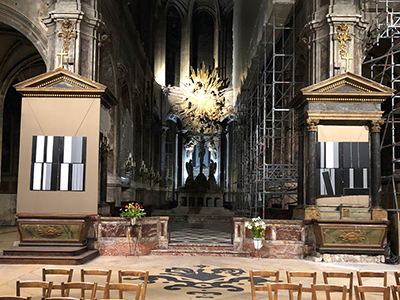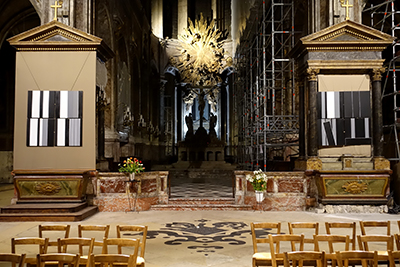 Quatre blocs sont installés au-dessus d’autels du XVIIIe. Chacun est formé de quatre tableaux, très légèrement espacés pour respirer et conter leur propre histoire, autonomes mais reliés aux autres par le récit et le montage.