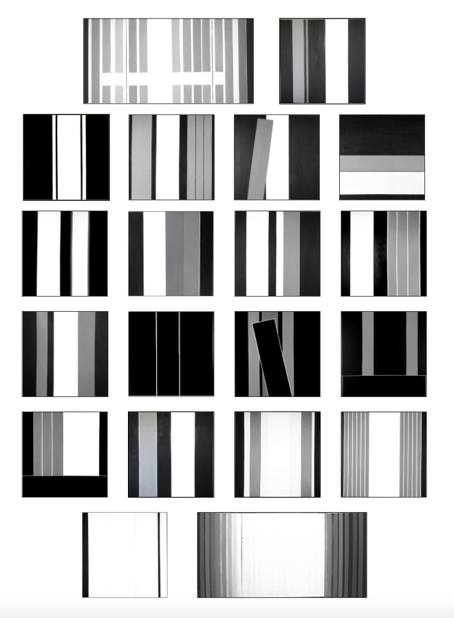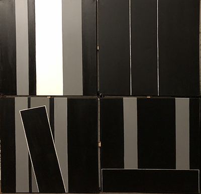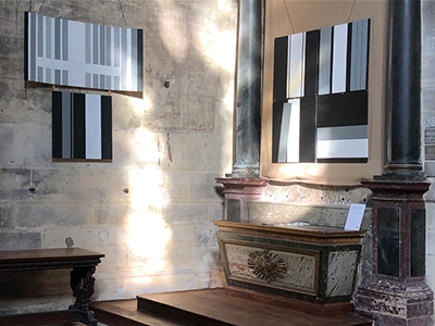Cette rigueur de la pensée se déploie dans les éléments d’une peinture dense, austère et dépouillée : des rectangles et des traits parfaitement rectilignes, dans une gamme très réduite de couleurs : blanc, gris et noir, celles d’ailleurs de Mondrian. Quel contraste avec les éléments décoratifs de l’église, la peinture classique, le rococo, la peinture figurative et prédicatrice du XIXe !