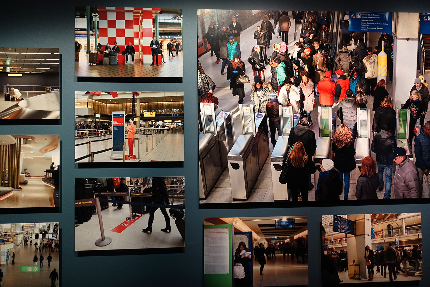 Géraldine Lay. Ne pas dépasser la ligne ! (2015). Elle rend compte de l’expérience que chacun fait dans les aéroports et les gares, ces lieux de transit intenses où tout est signalé et contrôlé, où l’on organise et gère de grandes inégalités entre voyageurs (cf. les classes affaires de l’avion et les low cost). Dans ces univers froids, les visages mettent alors de l’humanité. Que se passera-t-il lorsque les dispositifs de contrôles des faciès et yeux seront généralisés et permettront de tout surveiller comme déjà en Chine ? La mobilité repose sur des organisations sophistiquées qui n’autorisent pas toutes les libertés.