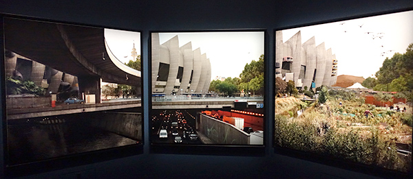 Caroline Delmotte et Gildas Etvenard. Le Tour de l’Île (2018). Leurs trois triptyques sonorisés ont des formes de retables en photos : des lieux de l’Île-de-France vus après les énergies fossiles, la voiture, dans la dépendance de la mobilité numérique. Dans « Porte Saint-Cloud », au centre, le présent, celui de tous les possibles, à gauche celui qui a subi la grande accélération jusqu’à l’effondrement, à droite un monde qui aura réagi à temps pour choisir une vie axée sur les rapports de proximité avec des jardins à la place des infrastructures. A nous de choisir. Un peu comme dans les tableaux du Jugement dernier, façon Jérôme Bosch…