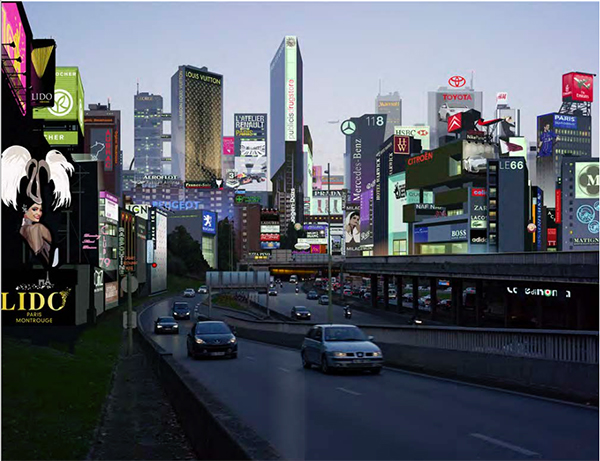 Alain Bublex. Paris, plan Voisin de Paris V2 circulaire secteur A23 (2013). Placée en face du Plan Voisin de Le Corbusier de 1925 qui a tant marqué les esprits, mais heureusement n’a pas été réalisé, la photo imaginée par Bublex montre ce qu’aurait pu être un centre de pouvoir de banlieue alors que le centre parisien aurait été un espace vert ! La valeur de l’utopie n’est pas de prévoir réellement l’avenir mais de poser des questions.